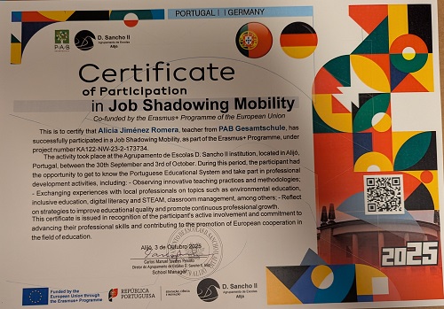 Ende September nahmen Frau Jiménez und Herr Moreno, Lehrkräfte der PAB, an einer Erasmus+-Jobshadowing-Aktivität in Alijó (Portugal) teil. Gemeinsam mit Kolleginnen und Kollegen aus Spanien und Lettland erhielten sie Einblicke in innovative Konzepte der digitalen Unterrichtsentwicklung.